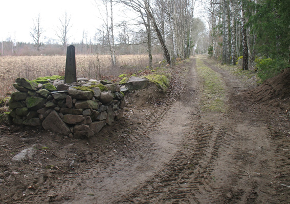 Bild 2. Milstolpen i sin rätta miljö längs den gamla landsvägen mellan Väckelsång och Tingsryd. Foto: Lars-Erik Englund.